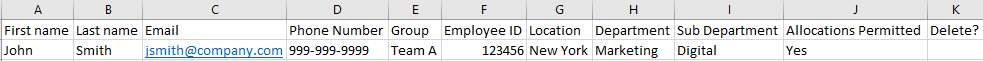 - Column K is how you can Bulk Delete these users. To do this, you include the word Yes for each user you would like to delete. When originally adding these users, this field should be blank.