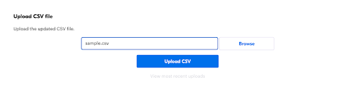 - Select Browse to locate the file you just saved. Once selected, choose Upload CSV at the bottom of the page. NOTE: If you encounter any errors while uploading your CSV, please refer to the bottom of this article for troubleshooting.