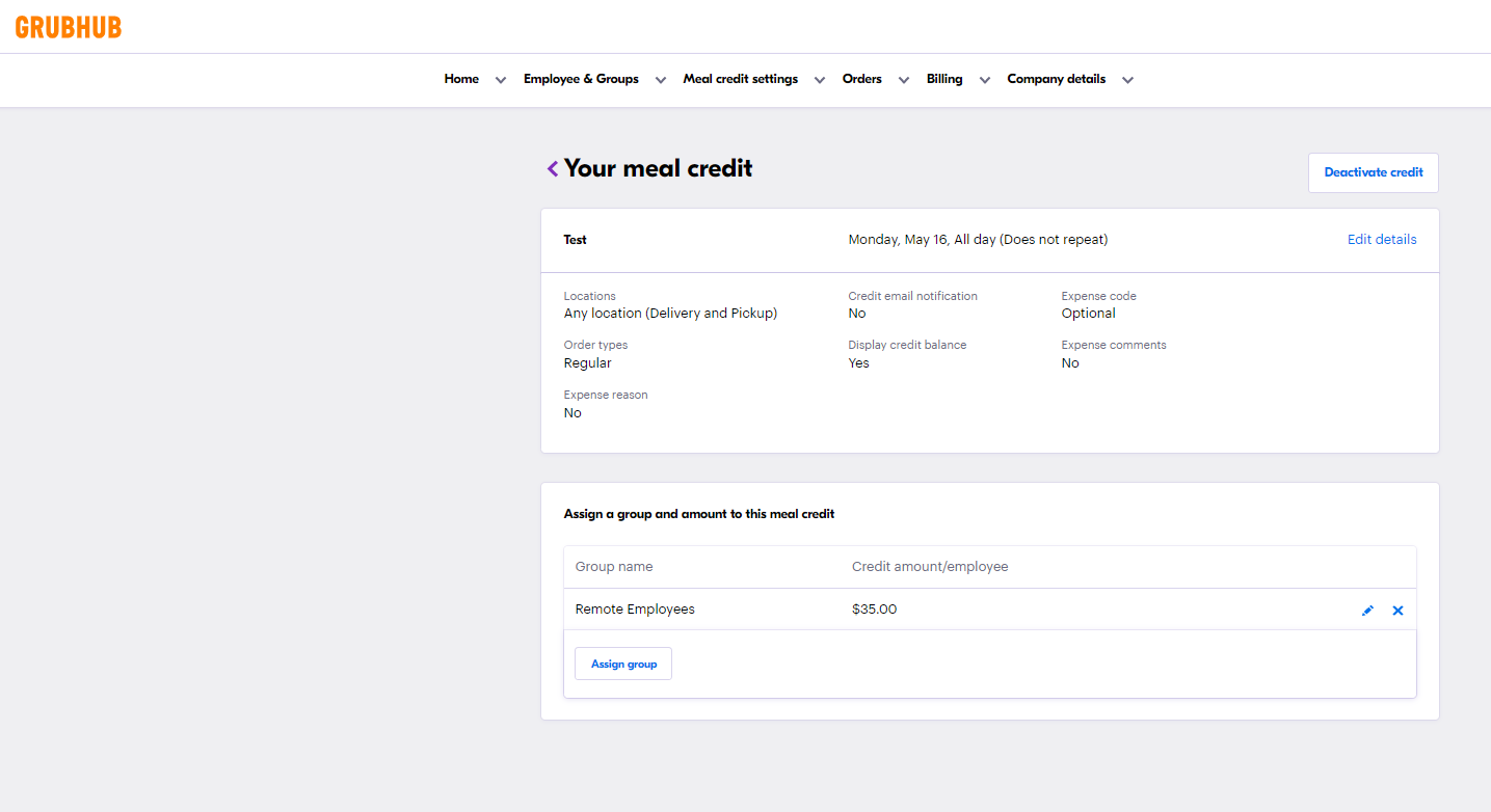 - Now that the users have been added to the Group you created, you will want to assign the appropriate meal credit. Select Meal credit settings found at the top of the page and click Add meal credit. You can find more information on creating meal credits here.