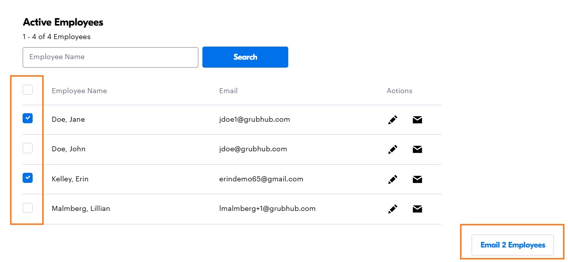 7. Once the profile has been built, go back to the Employees page, locate this user within your roster, and click on the envelope icon to the right of their name to send their Welcome Email. You can also send multiple welcome emails at once by checking off the box next to profiles on the left-hand side and clicking the "Email Employee" button at the bottom.