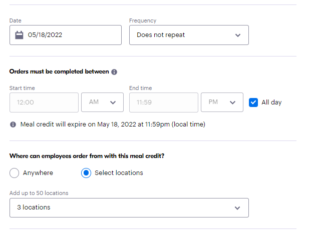 Your employees will now be able to apply their meal credits to orders going to the location(s) you designated. This goes into effect right away.