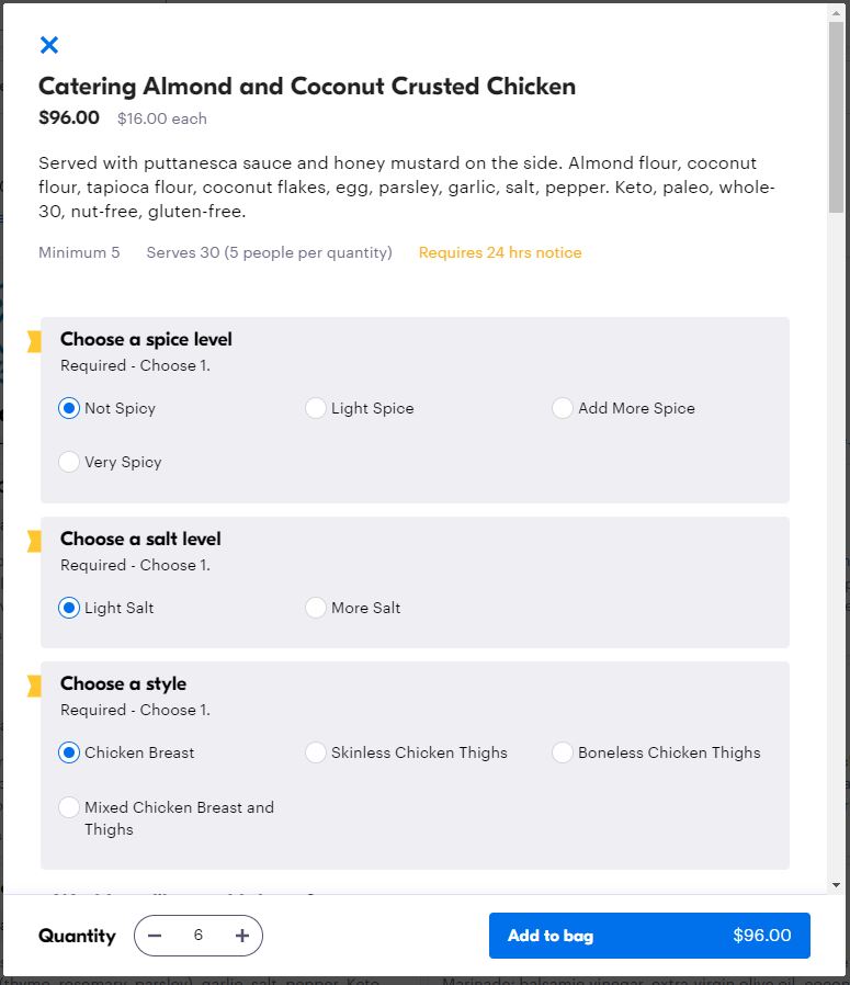 • When selecting menu items, make sure you pay attention to if the item is being priced per platter or per person and adjust the quantity amount as necessary.