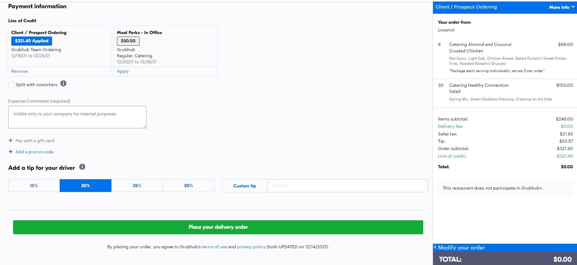 Just as you would when placing an individual order, apply your line of credit (if applicable), add any necessary expense code information, adjust your tip to desired amount, and click “Place your delivery order.” When the caterer confirms your order, you will receive a confirmation email.