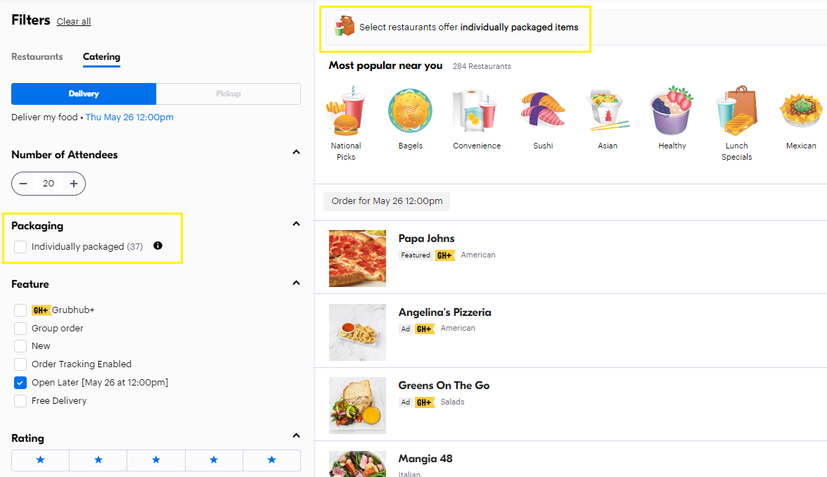 Depending on your location, you will also see the option to filter for catering restaurants that offer offer individually packaged catering. This combines the ease of ordering in bulk with the safety of individual meals.
