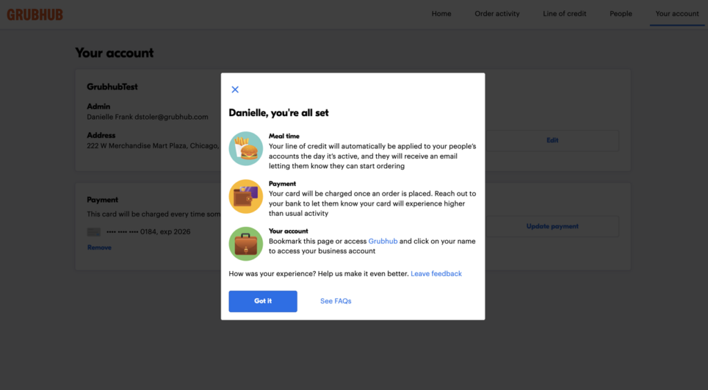 To access your account anytime, visit www.grubhub.com and sign in. Click on your name in the top-right corner and click “Business account” (the briefcase icon).