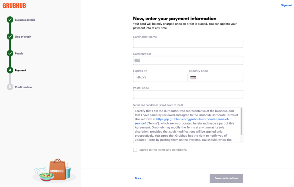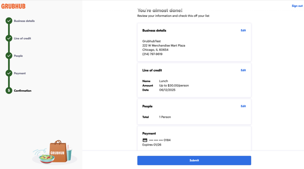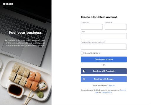 To get started with a Self-Service Corporate Account, create a Grubhub account at www.grubhub.com/corporate/signup