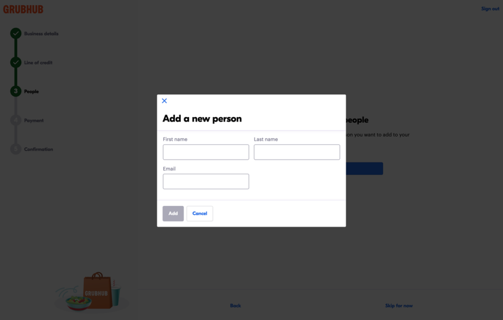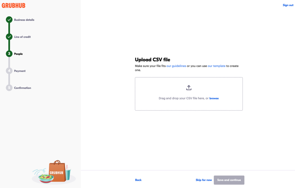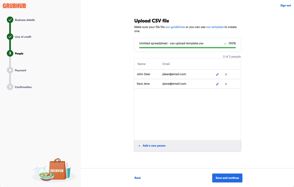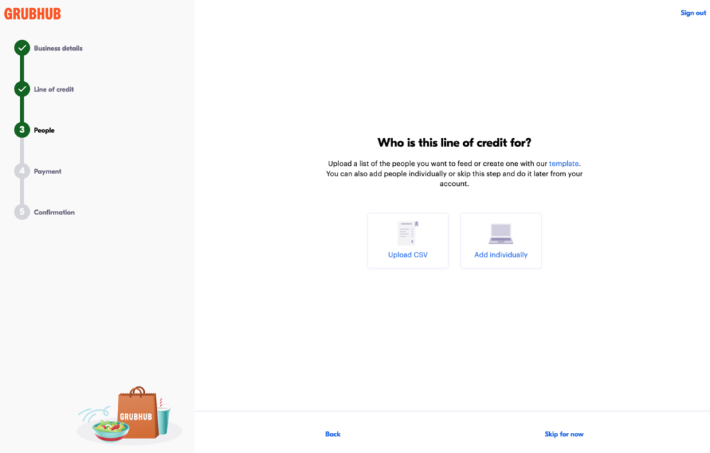 In step 3 of the signup flow, you can add people to your line of credit by uploading a CSV or adding people individually. You can also skip this step and add people to your line of credit after you complete the signup process. Once you add people to the line of credit, it is ready for use.